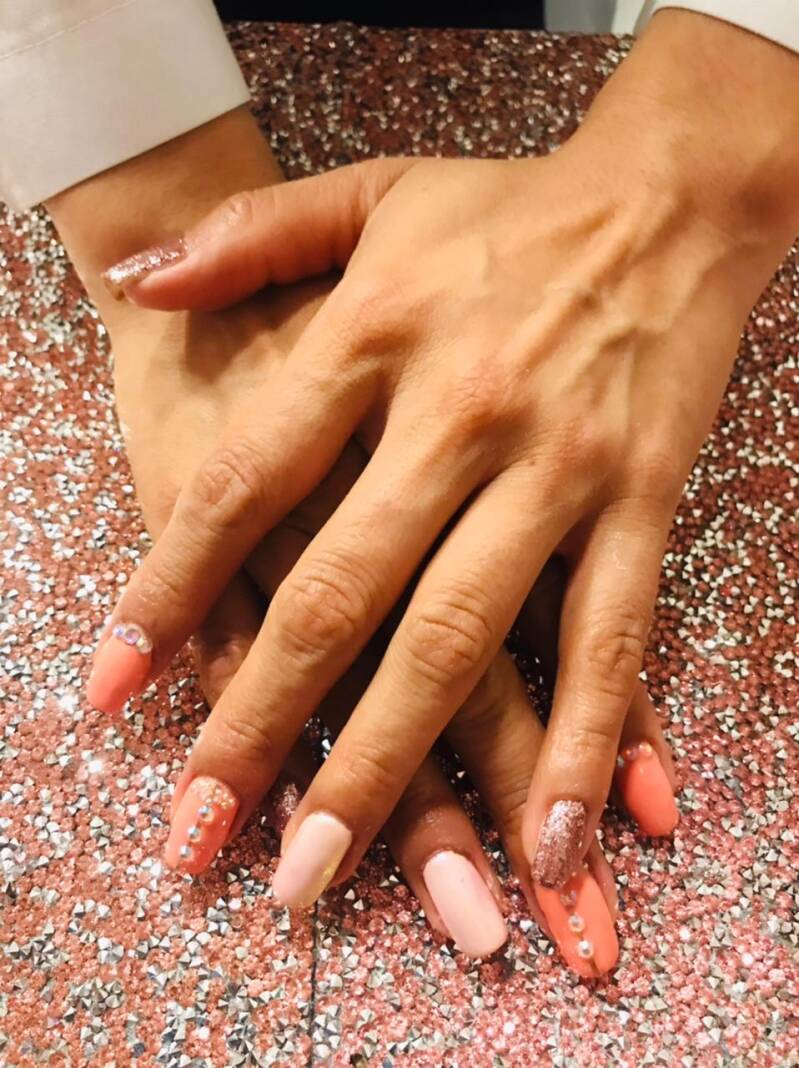 GEL SEMI PERMANENTE EN TONOS CORALES CON PIEDRAS, SOBRE UÑA NATURAL.