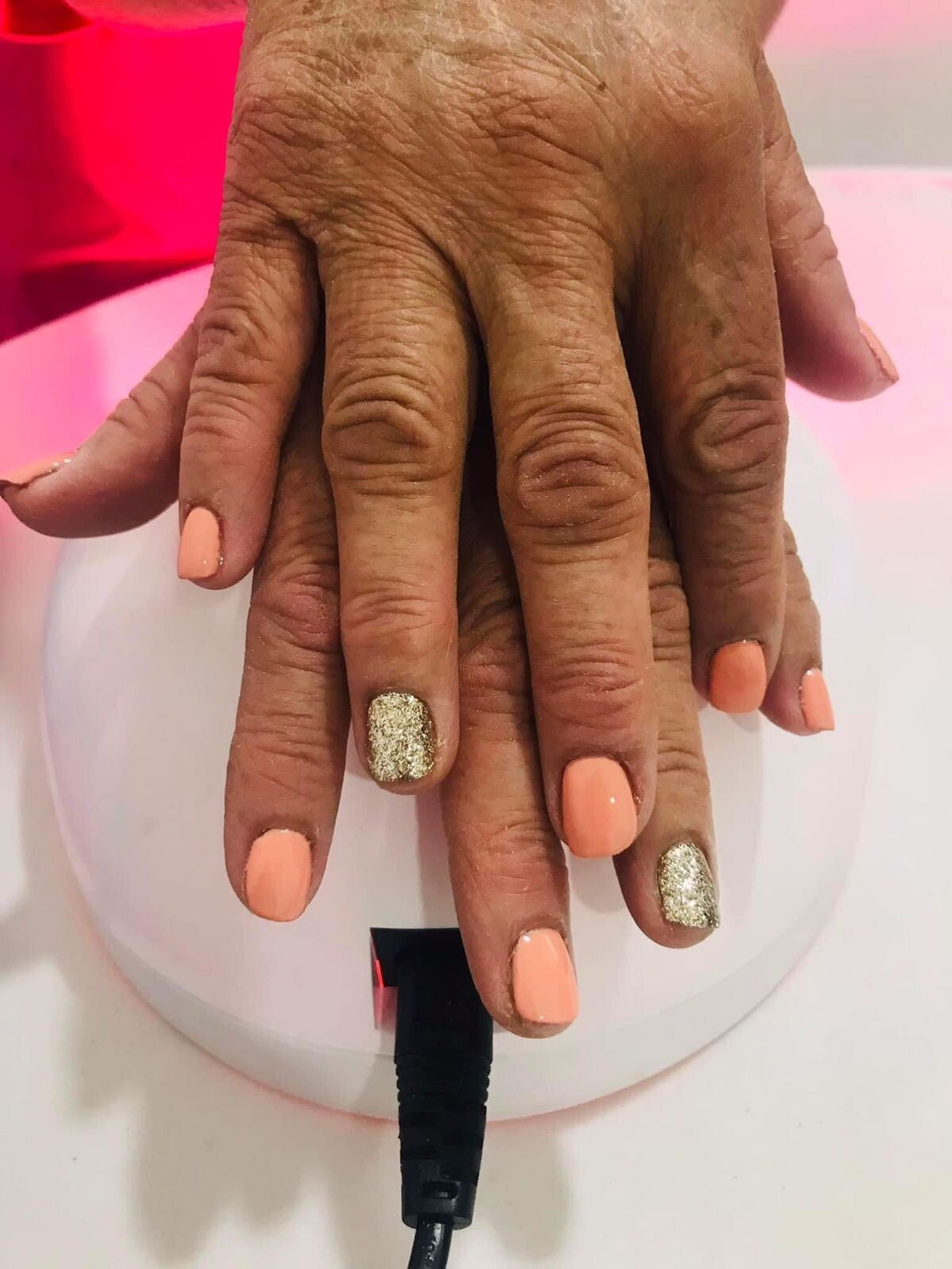 APLICACION DE GEL SEMI PERMANENTE EN TONO CORAL, CON GLITTER DORADO SOBRE UÑITA NATURAL.