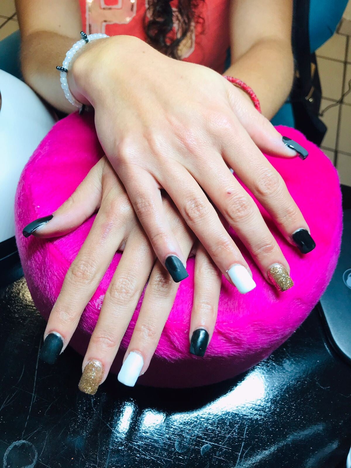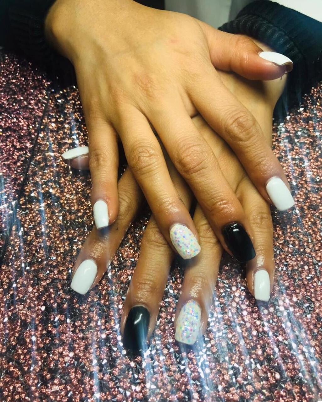 UÑAS EN TIP PUNTA CUADRADA, ESMALTADAS EN TONO NEGRO, BLANCO Y GLITTER DORADO.