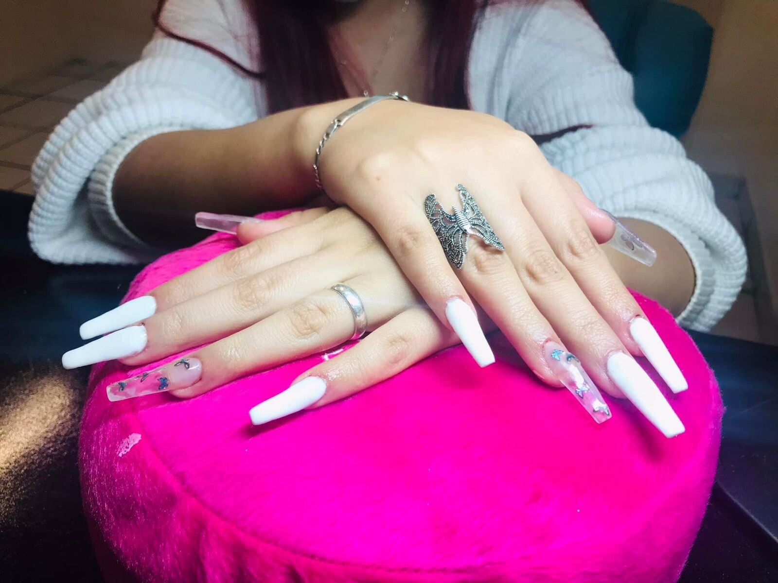 APLICACIÓN DE UÑAS ACRILICAS EN TIP, ESMALTADAS EN TONO BLANCO, CON DECORACION DE MARIPOSAS EN TIP TRANSPARENTE.