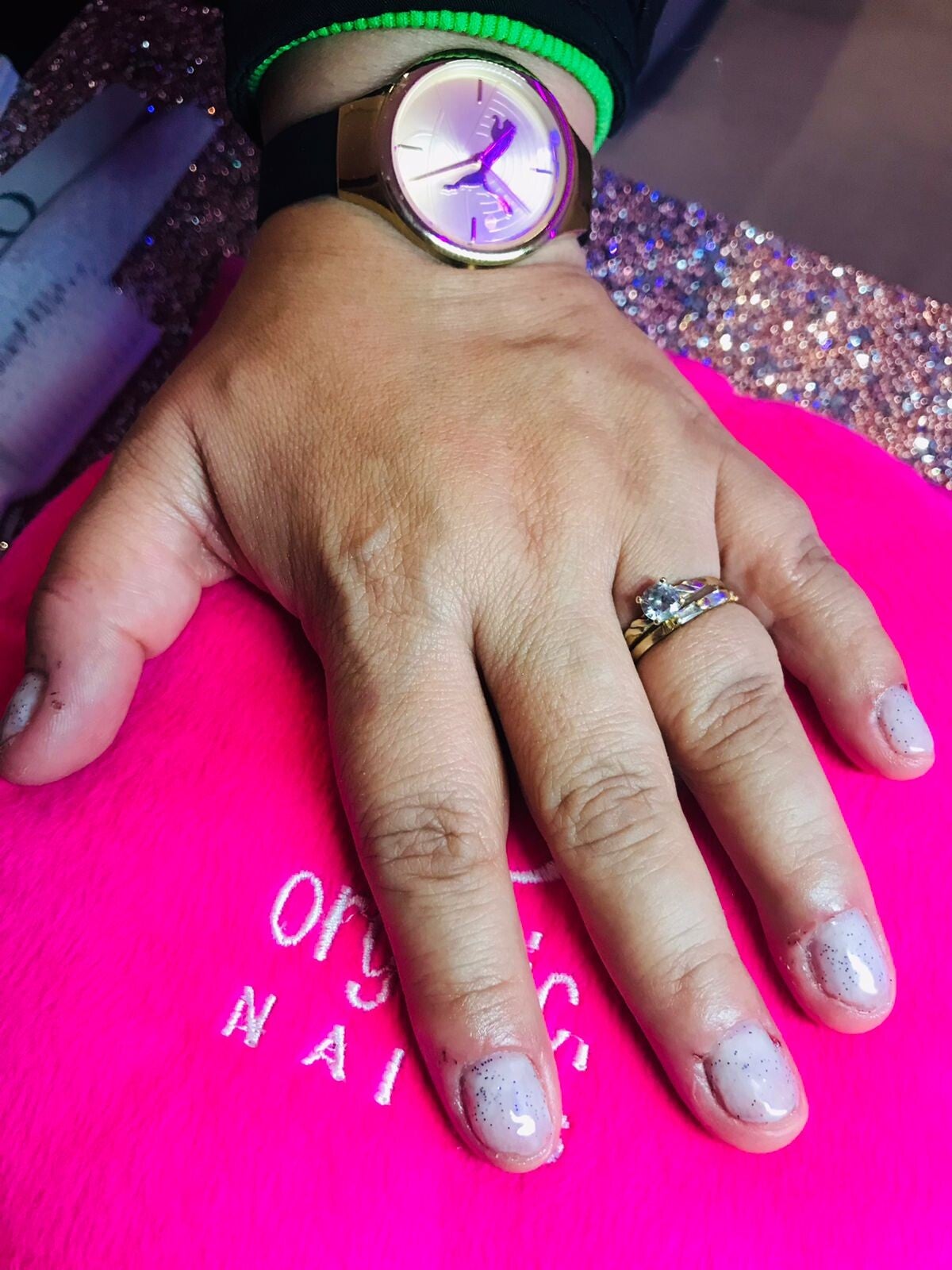 APLICACION DE GEL SEMI PERMANENTE EN TONO BLANCO LECHE CON GLITTER SOBRE UÑA NATURAL.