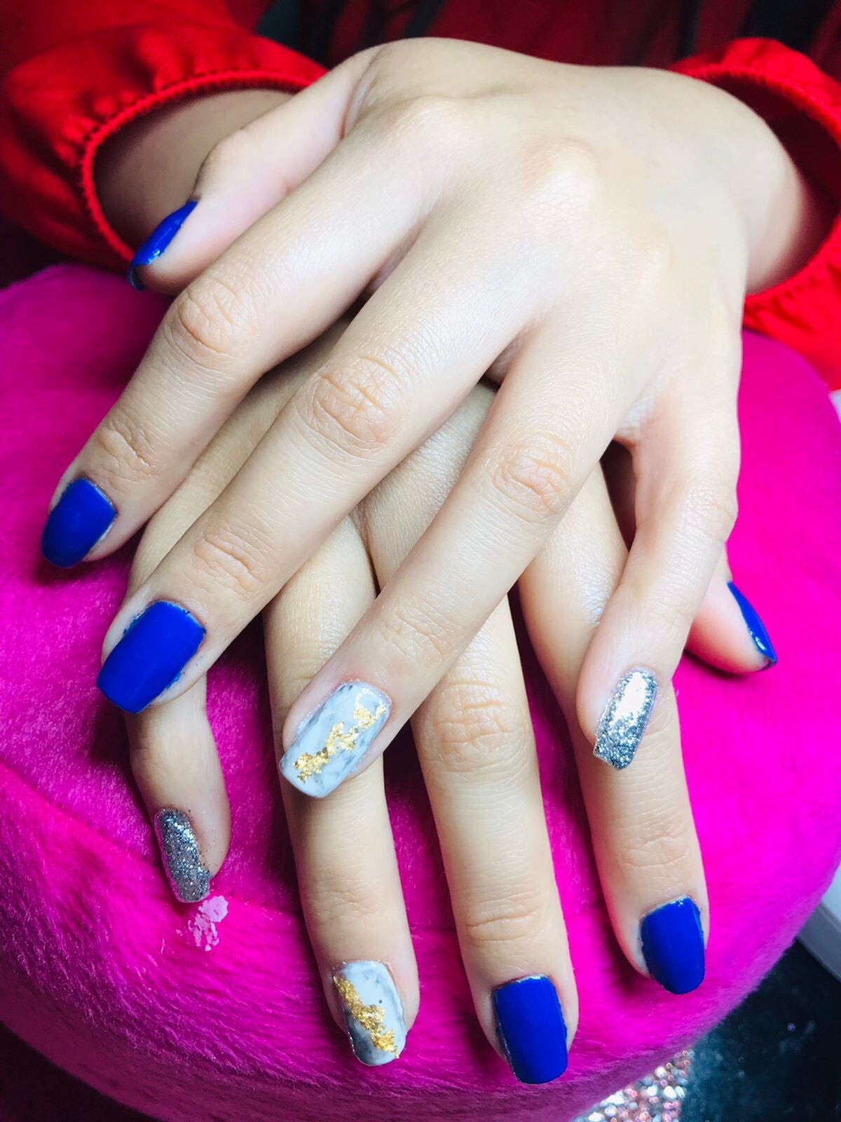 APLICACION DE ESCULTURALES EN TONOS AZUL MARINO CON UN TOQUE DE HOJA DE ORO Y EFECTO MARMOLEADO...